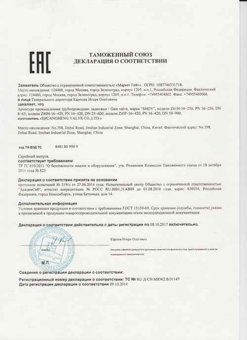 俄罗斯CU-TR证书 闸阀